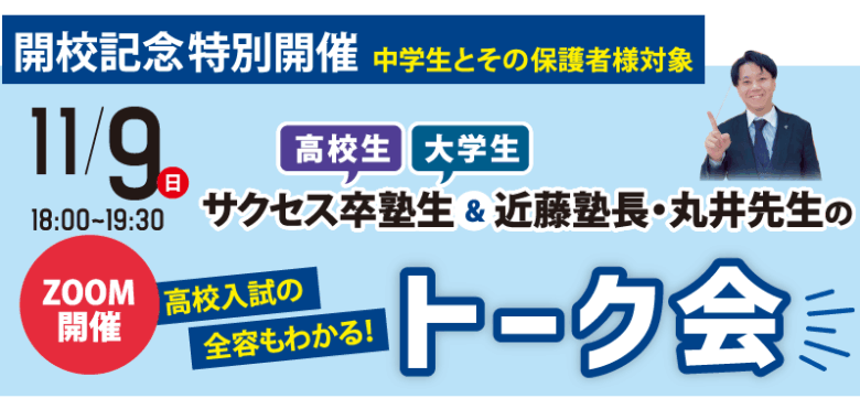 • 個別志導サクセスの卒業生を交えて、通塾当時の個別志導サクセスの活用の仕方高校生活、卒業後の進路などお話していきます。今後の個別志導サクセスの利用の仕方や将来のことなど、皆さんの参考になる話が聞けるハズ!