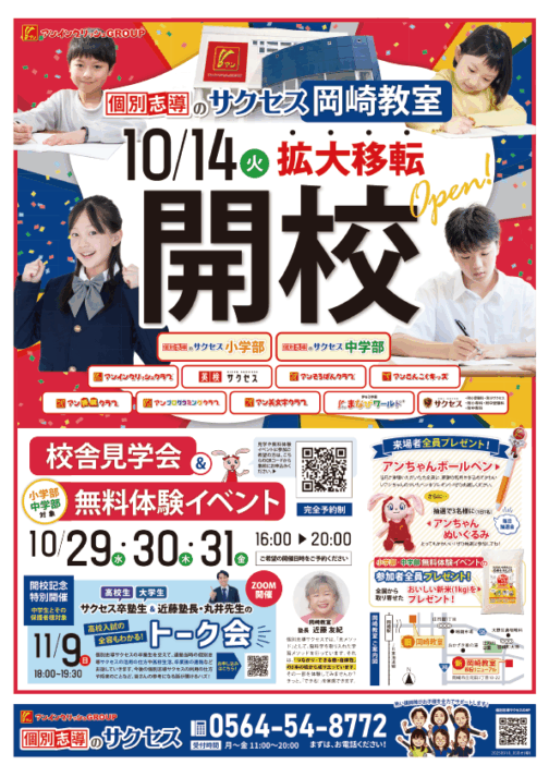 個別志導のサクセス 岡崎教室(愛知県岡崎市)が、拡大移転のため10/14(火)にリニューアル開校します。