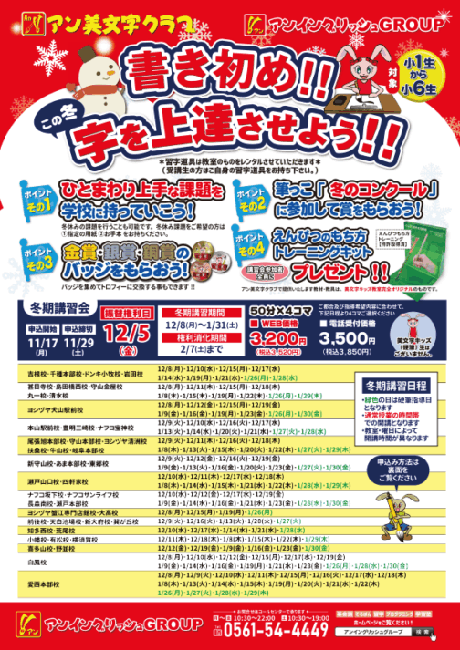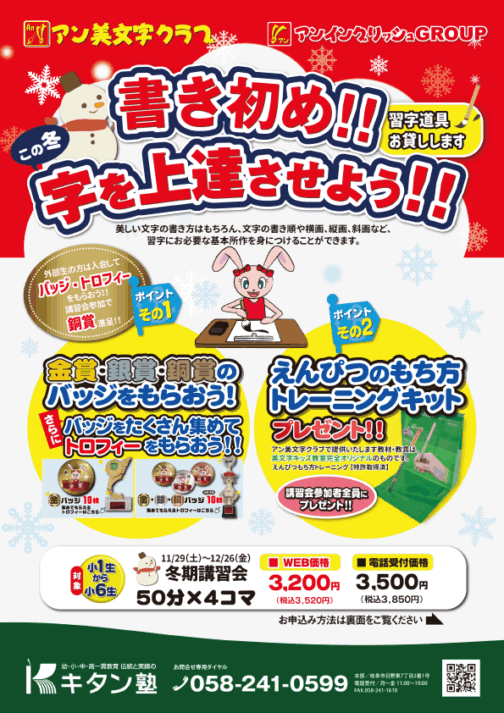 アン美文字クラブでは、「これから習字を始めよう」、「習字を習ってみたい!」というお子様のために冬期講習会を開講いたします。