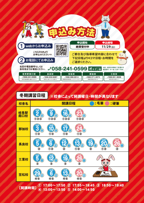 日程は下記の2025美文字冬期講習チラシよりご確認ください。