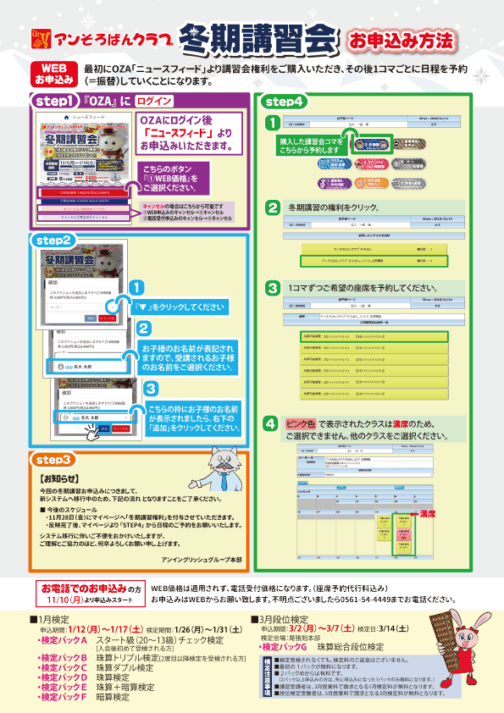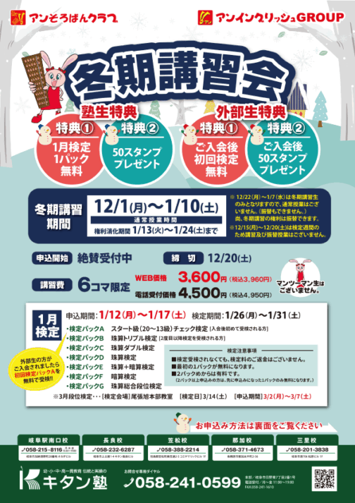 日程は下記の2025そろばんクラブ冬期講習チラシよりご確認ください。