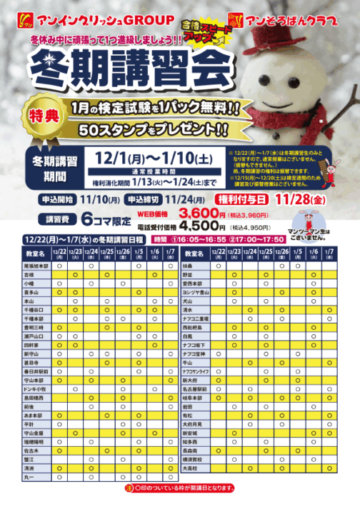※12/15(月)~12/20(土)は検定週間のため、講習及び振替授業はございません。