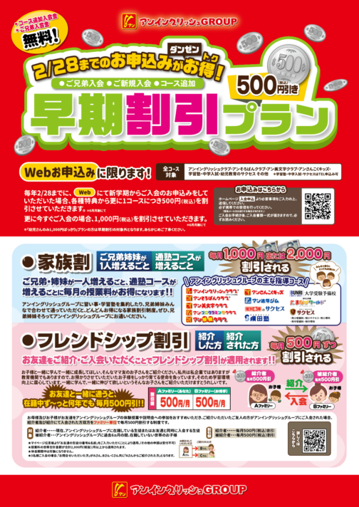 毎年2/28までに、WEBにて新学期からご入会のお申込みをしていただいた場合、各種特典から更に1コースにつき500円(税込)を割引※させていただきます。