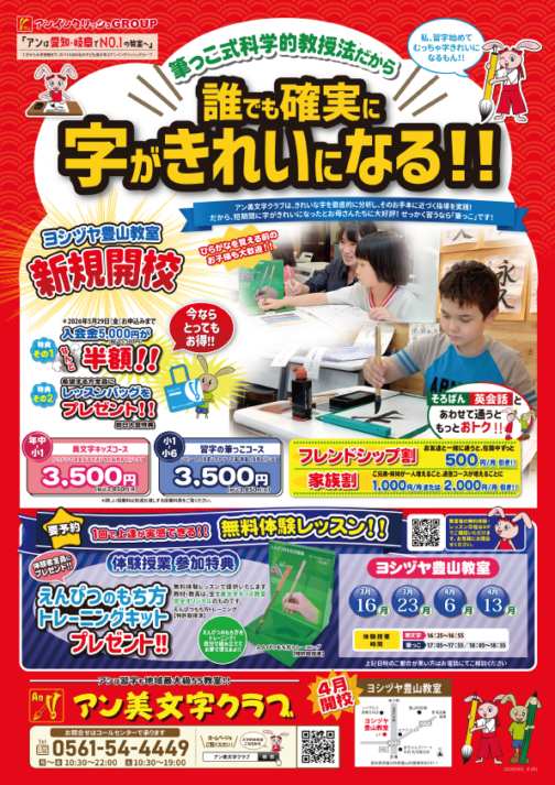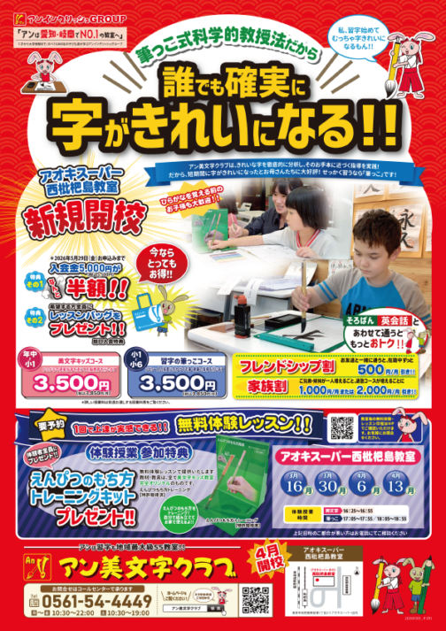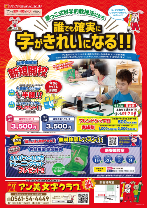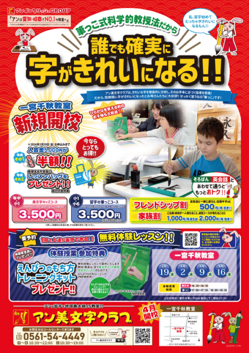 ナフコ二重堀教室・一宮千秋教室・ヨシヅヤ豊山教室・アオキスーパー西枇杷島教室・新安城教室の各教室で、2026年4月~【アン美文字クラブ】が開講いたします。