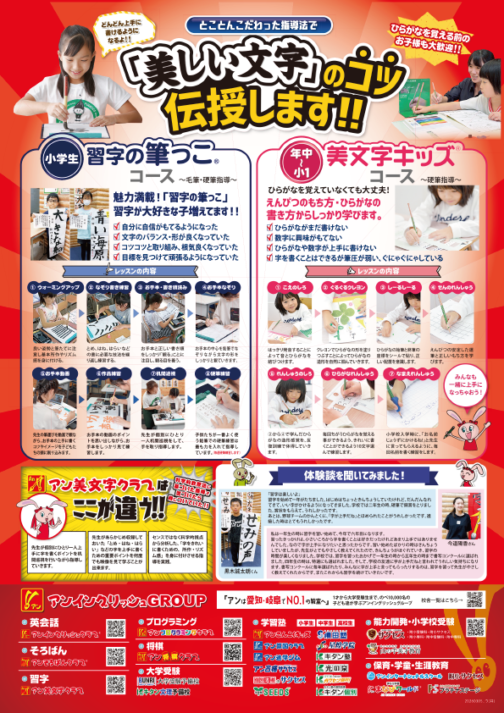 アン美文字クラブは、きれいな字を徹底的に分析し、そのお手本に近づく指導を実践! 短期間に字がきれいになったとお母さんたちに大好評な習字教室です。