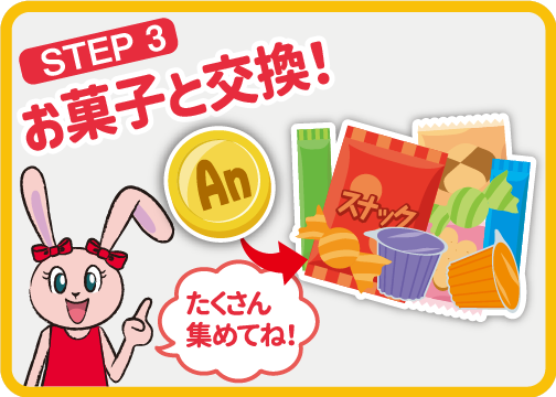 集めた「Anコイン」は自分が欲しいお菓子と交換できるよ!