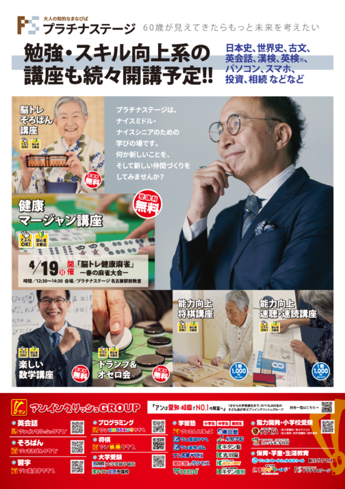 大人の知的なまなびば『プラチナステージ』では、ファイナンシャルプランナーの先生をお招きし 2026年4月19日に入場無料の定期講演会を開催します。