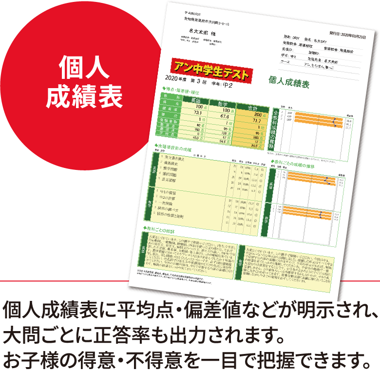 中学校の定期テストは前回の定期テスト以降に学習した内容から主に出題されます。模擬テストは、基礎的な問題が少なく難易度が高い問題が多いのが特徴で、出題範囲も一部の単元に限られていることがほとんどです。しかしアン中学生テストは、出題範囲は既習範囲すべてで出題数が多いのが特徴です。そのため、お子さんに弱点単元があれば、しっかりチェックできるように作成されています。(そのことを以後の学習で克服するためです)また、模擬試験に出題されがちな、複単元複合問題や、総合問題の出題は少なくなっています。